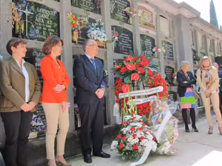 El acto de homenaje ha comenzado con una ofrenda floral por parte de la presidenta del Gobierno de Navarra, el alcalde de Pamplona y actuales concejales del Ayuntamiento de Pamplona que han depositado junto a la tumba de Tomás Caballero una corona de flores rojas y varios ramos.