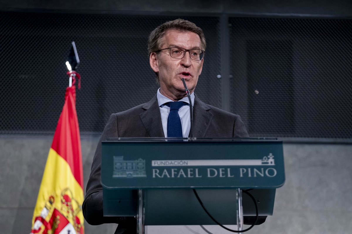 El presidente del Partido Popular, Alberto Núñez Feijóo, clausura el encuentro sobre la fragilidad de la democracia en tiempos de populismo y polarización, en la Fundación Rafael del Pino, a 2 de abril de 2024, en Madrid (España). El encuentro se titula - A. Pérez Meca - Europa Press