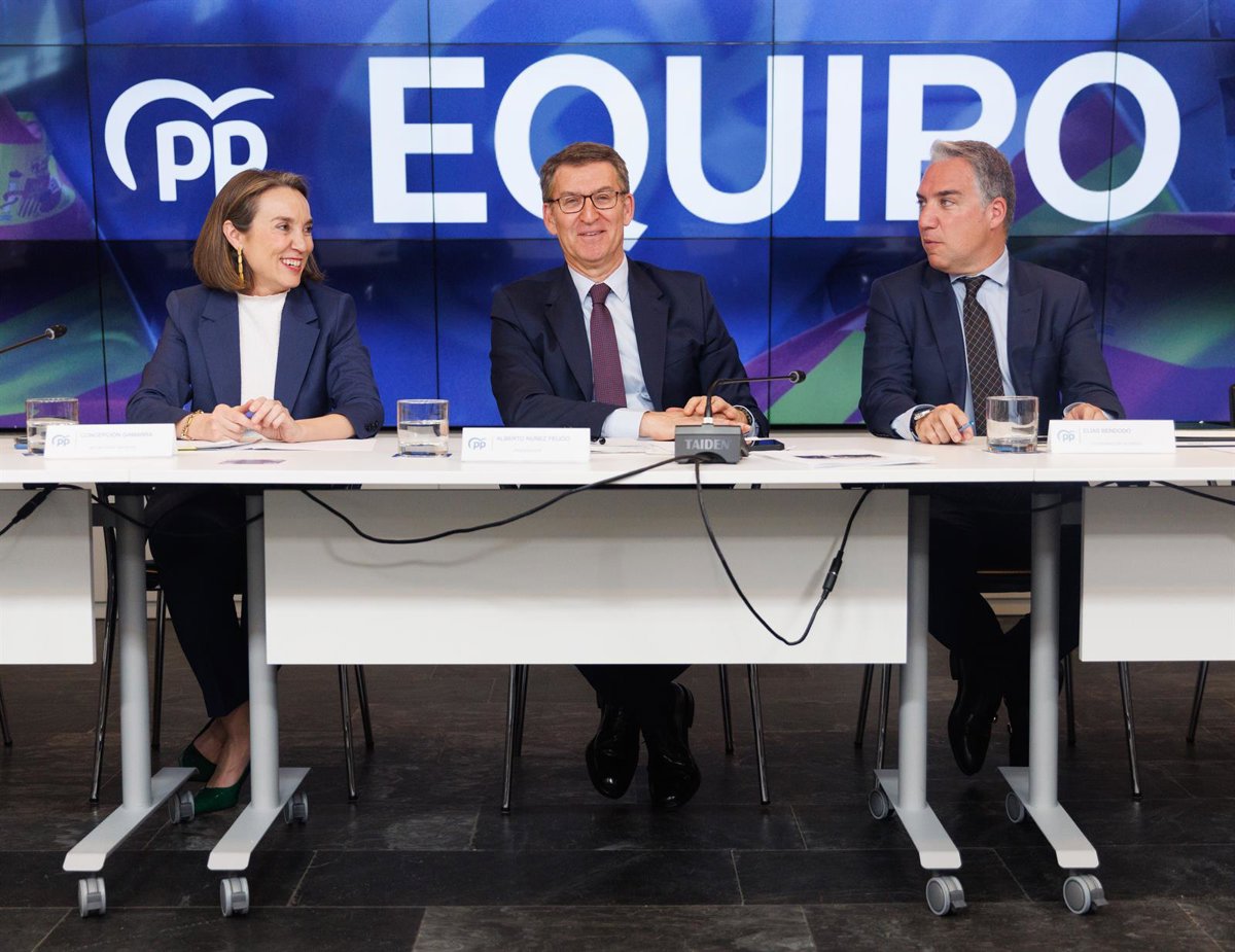 (I-D) La portavoz del PP en el Congreso, Cuca Gamarra; el presidente del Partido Popular, Alberto Núñez Feijóo y el coordinador general del Partido Popular, Elías Bendodo, durante la reunión del Comité Ejecutivo Nacional, en la sede nacional del PP, a 1 - Eduardo Parra - Europa Press