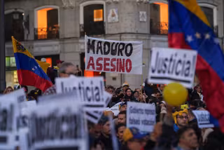 Decenas de personas durante la concentración contra el régimen de Nicolás Maduro antes de la toma de posesión como presidente de Venezuela, en la Puerta del Sol, a 9 de enero de 2025, en Madrid (España). El objetivo de la protesta es arropar al pueblo ven - Diego Radamés - Europa Press