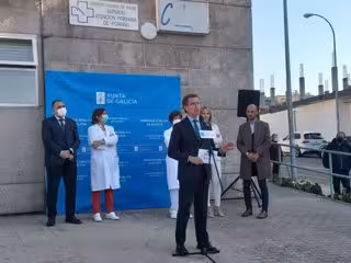 El líder del PP y presidente de la Xunta, Alberto Núñez Feijóo, visita un centro de salud en O Porriño (Pontevedra), donde atiende a los medios de comunicación. - EUROPA PRESS