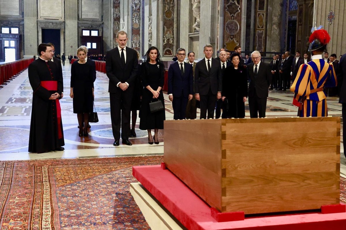 El mensaje de Feijóo está acompañado de una fotografía en la que se ve a la delegación española encabezada por los Reyes Felipe VI y Letizia, las vicepresidentas del Gobierno María Jesús Montero y Yolanda Díaz, y el ministro de la Presidencia, Justicia y Relaciones con las Cortes, Félix Bolaños, ante el féretro de Francisco en el interior de la Basílica de San Pedro.