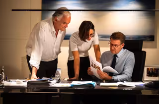 El líder del PP, Alberto Núñez Feijóo, prepara el debate de investidura junto a su jefa de gabinete, Marta Varela, y el vicesecretario de Institucional del PP, Esteban González Pons. - DAVID MUDARRA (PP)
