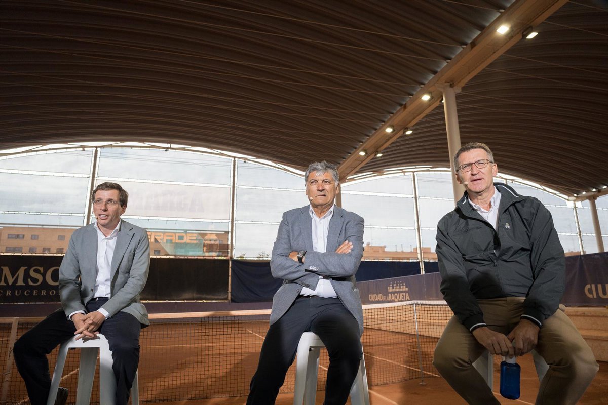 (I-D) El alcalde y candidato del PP a la reelección, José Luis Martínez-Almeida; el tío de Rafa Nadal y director de la Rafa Nadal Academy by Movistar, Toni Nadal, y el líder del PP, Alberto Núñez Feijóo, durante un coloquio, en la Ciudad de la Raqueta, - Diego Radamés - Europa Press