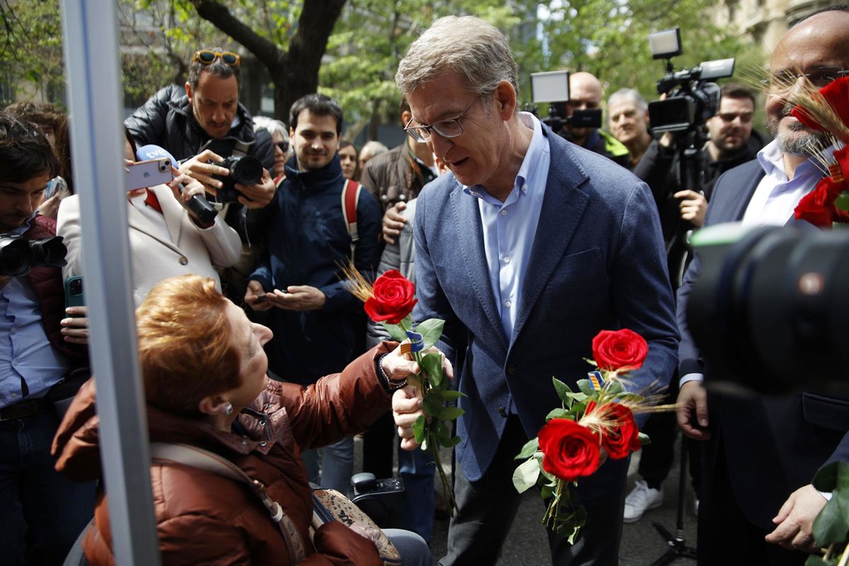 Una mujer ofrece una rosa al presidente del PP, Alberto Núñez Feijóo, durante su visita a Barcelona por el día de Sant Jordi, a 23 de abril de 2024, en Barcelona, Catalunya (España). Feijóo ha aprovechado la ocasión para apoyar al presidente del PP de C - Kike Rincón - Europa Press