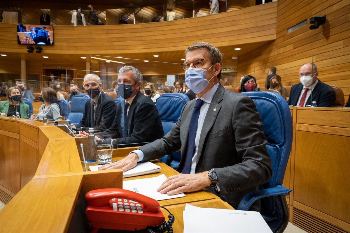 El presidente de la Xunta, Alberto Núñez Feijóo, junto a sus vicepresidentes Alfonso Rueda y Francisco Conde en la primera sesión de control en el Parlamento de Galicia tras su proclamación como nuevo presidente del Partido Popular - DAVID CABEZÓN/XUNTA DE GALICIA