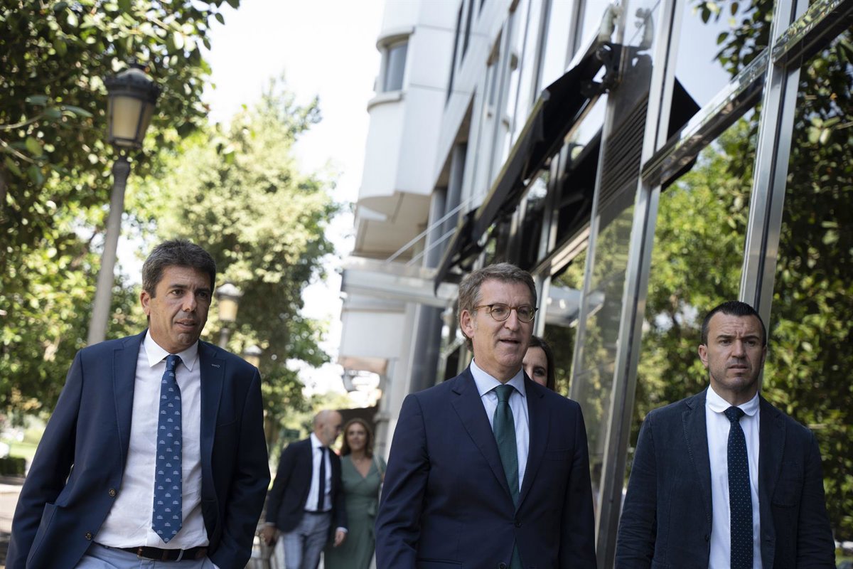 Archivo - El presidente del Partido Popular, Alberto Núñez Feijóo (c), y el presidente de la Diputación de Alicante, Carlos Mazón (i), llegan al pleno de la Asociación Valenciana de Empresarios (AVE), en la sede Hotel SH, a 21 de julio de 2022, en Valen - Jorge Gil - Europa Press - Archivo