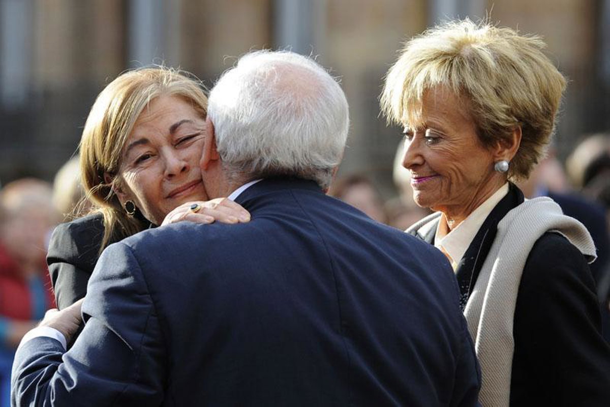 Justo después llegó la viuda de Sabino Fernández Campo, María Teresa Álvarez, acompañada de los familiares del Conde de Latores. Tras recibir las condolencias, se produjo uno de los momentos más emotivos cuando María Teresa Álvarez se fundió en un abrazo con el director de la Fundación Príncipe de Asturias, Graciano García, y rompió a llorar.