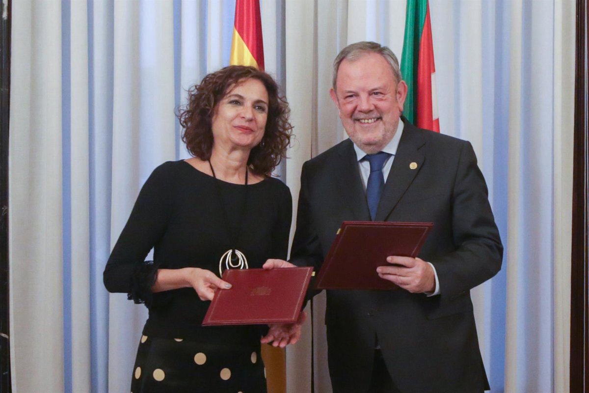 La ministra de Hacienda y portavoz del Gobierno, María Jesús Montero y el consejero de Hacienda y Economía del Gobierno de Euskadi, Pedro Azpiazu, posan tras la reunión de la Comisión Mixta del Concierto Económico - Ricardo Rubio - Europa Press