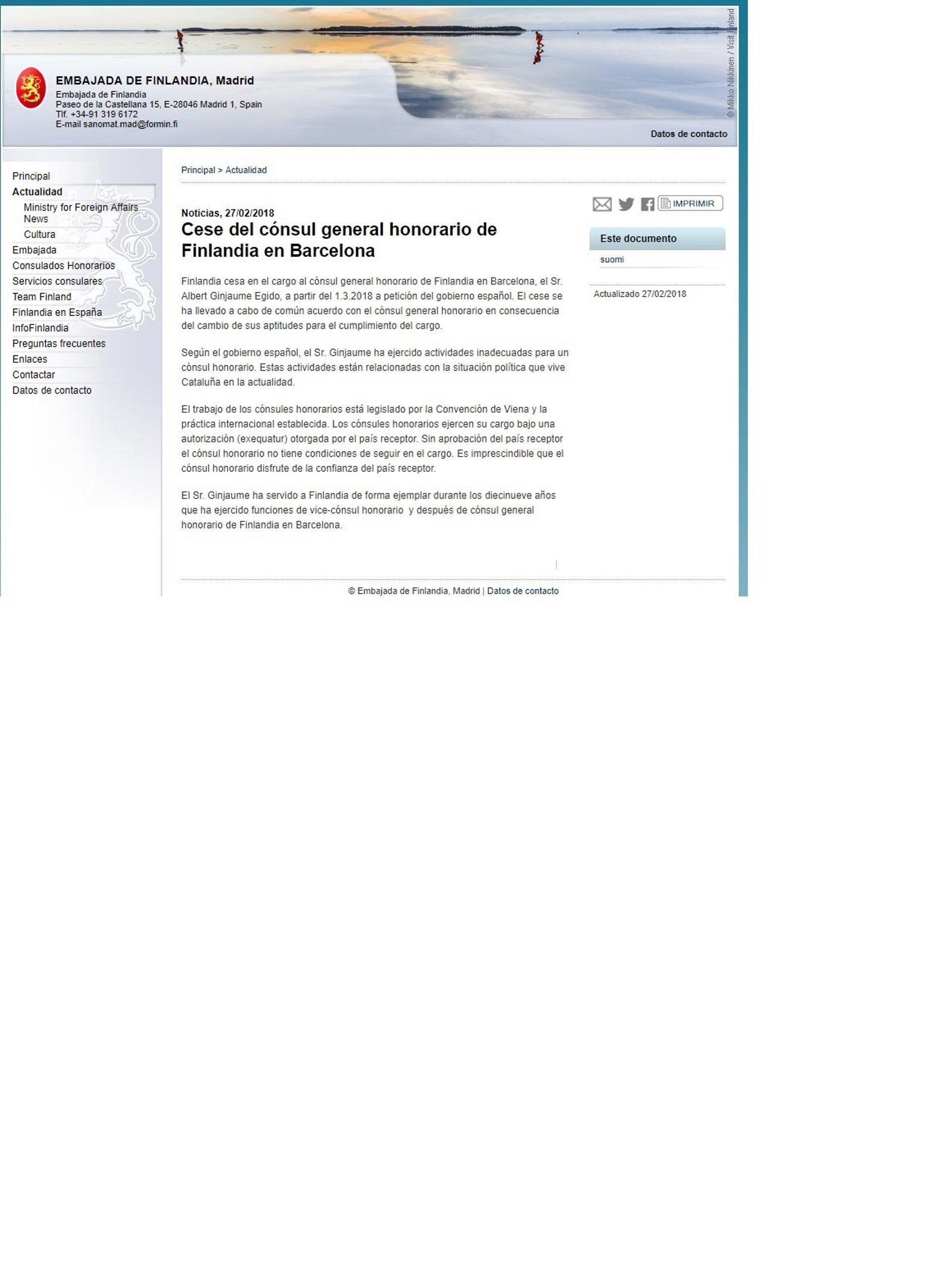 El Gobierno de Finlandia ha precisado este martes que el cese de su cónsul honorario en Barcelona, Albert Ginjaume Egido, se ha producido "a petición del Gobierno español", que ha avisado de que estaba ejerciendo "actividades inadecuadas para un cónsul honorario".