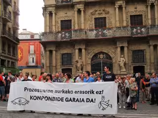Los asistentes se han concentrado a partir de las 19.00 horas en la plaza del Ayuntamiento de Pamplona tras la pancarta 'Prozesuaren aurkako erasorik ez. Konponbide garaia da' (No a los ataques contra el proceso. Es tiempo de soluciones).