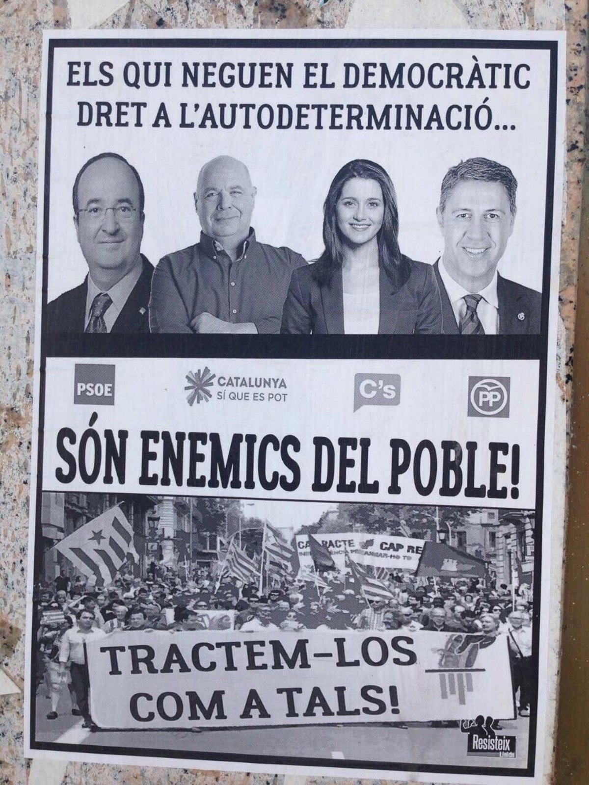 "La Fiscalia de Lleida a la vista de los carteles en tono amenazante aparecidos en la ciudad con la fotografía de diferentes líderes políticos y el mensaje 'Els qui neguen el democràtic dret a l'autodeterminació són enemics del poble. Tractem-los com a tals' ('Quienes niegan el democrático derecho a la autodeterminación son enemigos del pueblo. Tratémoslos como a tales') ha decidido en el día de hoy abrir diligencias de investigación", señala el Ministerio fiscal en un comunicado.