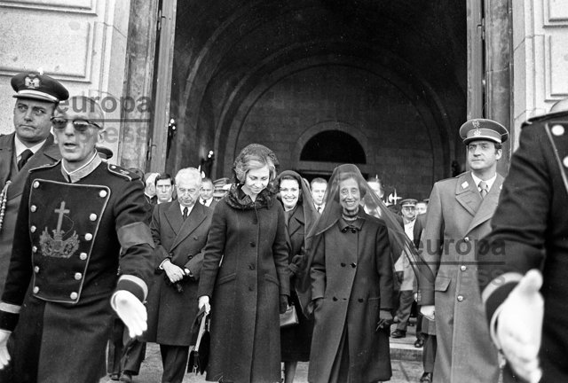 SAN LORENZO DEL ESCORIAL, MADRID (ESPAÑA) - NOVIEMBRE 23, 1975: Entierro en el Valle de los Caídos del dictador Francisco Franco, tras su muerte tres días antes por una insuficiencia cardíaca. En la foto: El Rey Juan Carlos I, la Reina Sofía y la viuda de Franco, Carmen Polo, a su salida de la Basílica tras el funeral y entierro de Franco, en San Lorenzo del Escorial, Madrid (España) a 23 de noviembre de 1975.