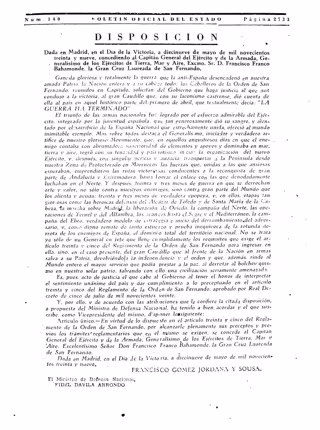 El Boletín Oficial del Estado (BOE) que se publicó ese 19 de mayo de 1939 rezaba textualmente: "Dada en Madrid, en el Día de la Victoria, a diecinueve de mayo de mil novecientos treinta y nueve, concediendo al Capitán General del Ejército y de la Armada, Generalísimo de los Ejércitos de Tierra, Mar y Aire, Excmo. Sr. D. Francisco Franco Behamonte, la Gran Cruz Laureada de San Fernando"