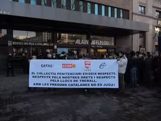 Los manifestantes han partido a las 12.00 horas de este jueves de la sede de la Dirección General de Servicios Penitenciarios en la calle Aragón donde se concentran diariamente para apoyar a los representantes sindicales que negocian con el Govern y que han pasado dos noches en el interior del edificio en señal de protesta.