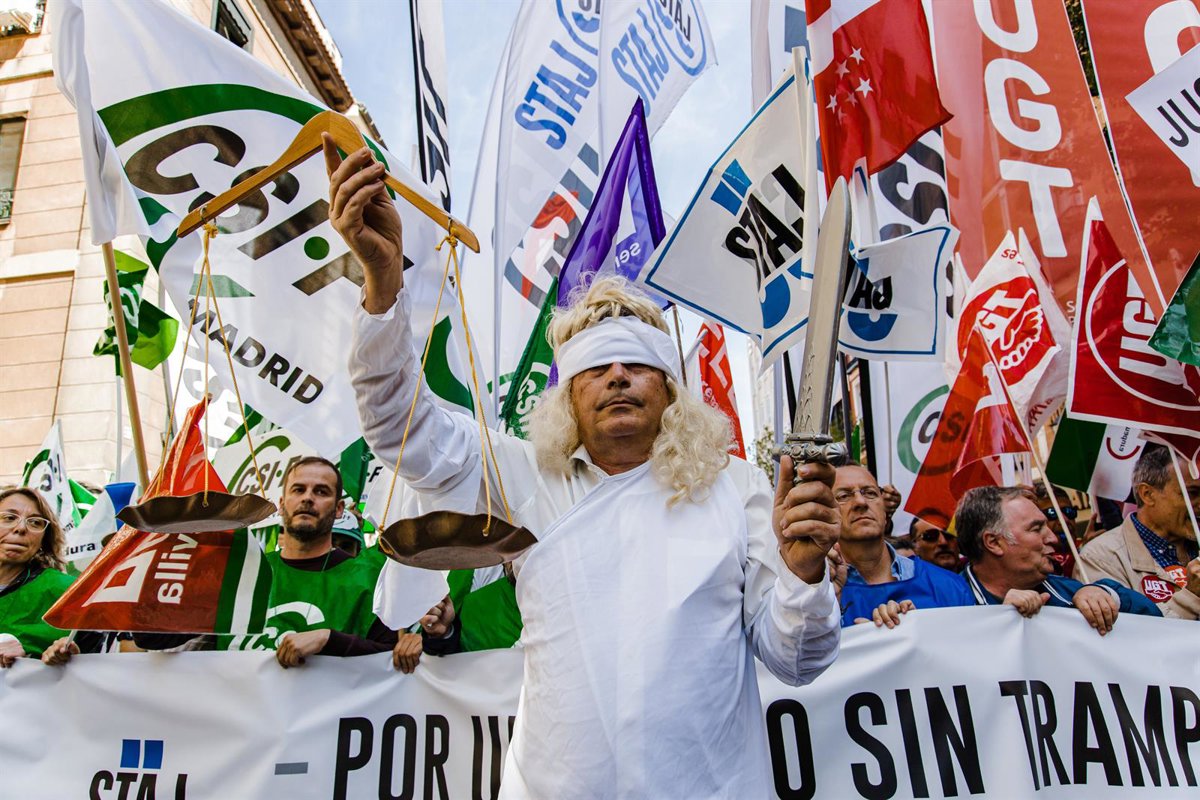 Manifestantes durante una protesta para reclamar una subida salarial, en la sede del Ministerio de Justicia. - Carlos Luján - Europa Press