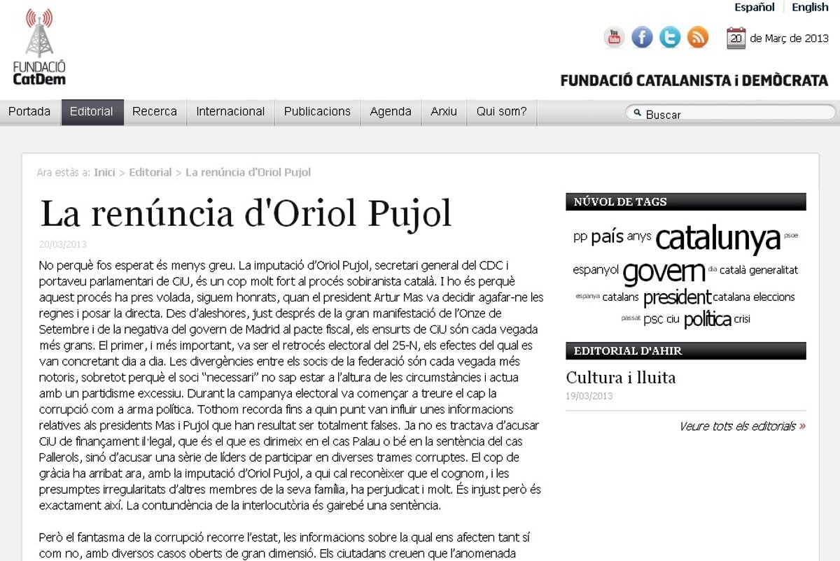 Según la Catdem, la cuestión no es si Oriol Pujol debe dimitir también como diputado, sino que el proceso soberanista "recibe un fuerte golpe porque debilita un poco más e partido soberanista mayoritario".