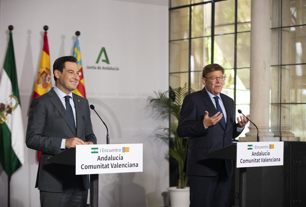 Archivo - El presidente de la Junta, Juanma Moreno (i), y el presidente de la Generalitat Valenciana, Ximo Puig (d), comparecen en rueda de prensa tras la reunión el I Encuentro Andalucía-Comunitat Valenciana. A 21 de septiembre de 2021, En Sevilla (And - María José López - Europa Press - Archivo
