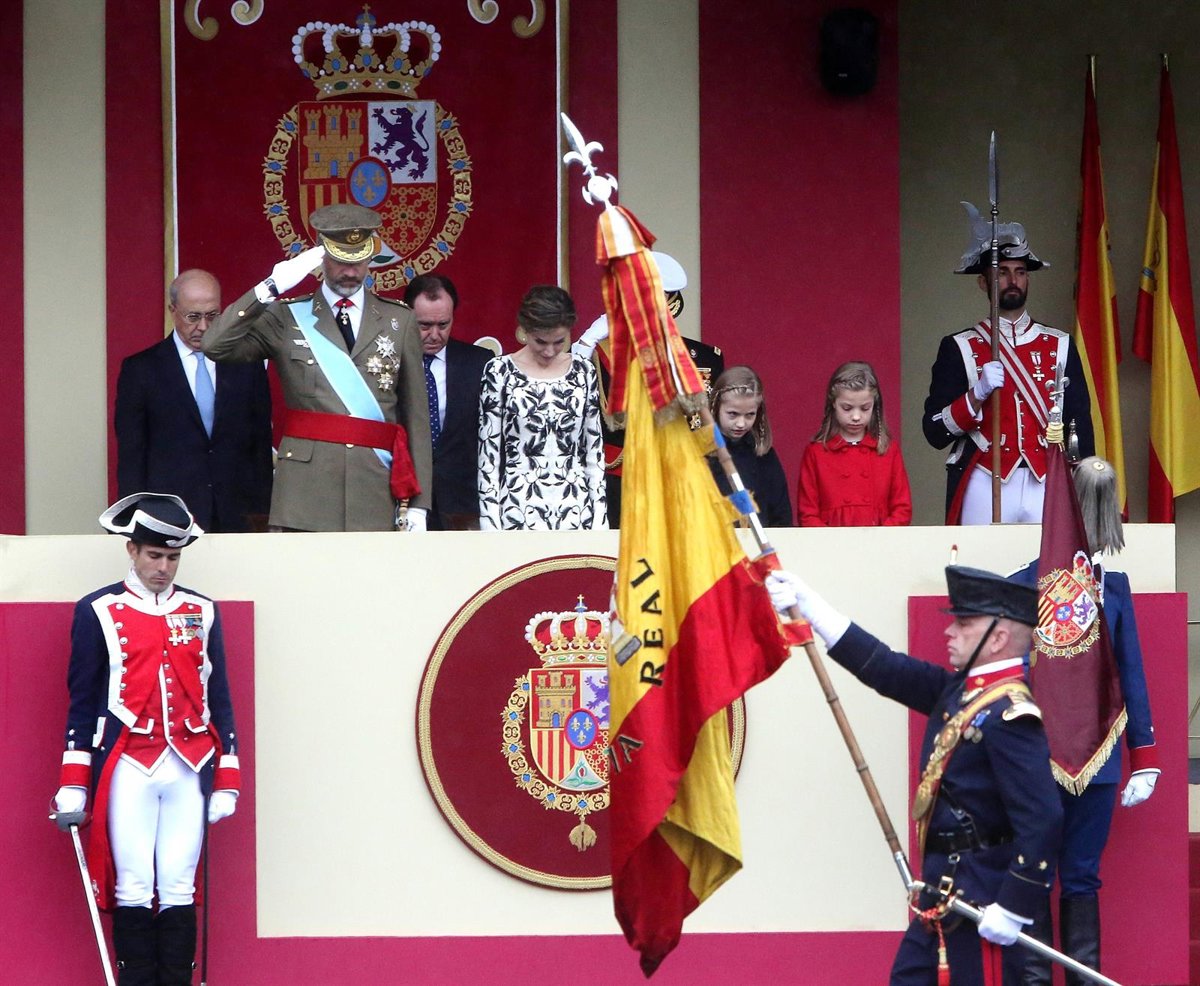 Los Reyes Felipe y Letizia han presidido este miércoles un desfile militar con motivo del Día de la Fiesta Nacional del 12 de octubre muy deslucido por la lluvia que ha estado cayendo, en ocasiones bastante fuerte, durante toda la mañana en Madrid.