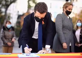 El presidente del Partido Popular, Pablo Casado, durante firma contra la 'Ley Celaá', en la mesa instalada por el PP de Madrid en las inmediaciones del Congreso. - Eduardo Parra - Europa Press