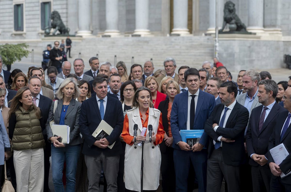 La secretaria general del PP y portavoz del Grupo Parlamentario Popular, Cuca Gamarra (c), atiende a medios a las puertas del Congreso del Congreso de los Diputados, a 20 de octubre de 2023, en Madrid (España). Gamarra ha denunciado el cierre de la Cáma - Alberto Ortega - Europa Press