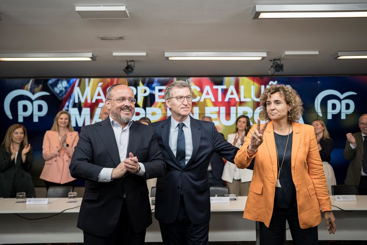 (I-D) El candidato del PP para las elecciones catalanas, Alejandro Fernández, el presidente del PP, Alberto Núñez Feijóo, y la candidata del PP a las elecciones europeas, Dolors Montserrat, durante la reunión del Comité Ejecutivo Nacional, en la sede de - Diego Radamés - Europa Press