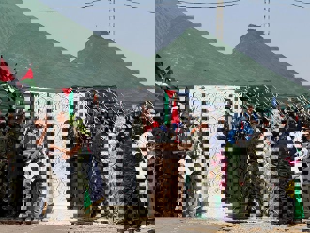 Tras el discurso de Ghali, que ha llamado a los saharauis a mantener la unidad para hacer frente a los desafíos de cara a alcanzar su soberanía, ha tenido lugar un desfile militar que han arrancado, acompañados por dromedarios, los combatientes más veteranos en las filas del Polisario, entre ellos Batir Mohamed, quien comenzó a combatir con 14 años, o Noussa, quien nació en Villa Cisneros y resultó herido durante la guerra contra Marruecos en 1982.
