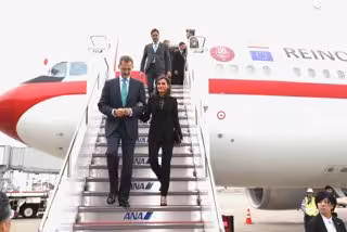 Los Reyes, Felipe VI y Letizia bajan por la escalera del avión en el Aeropuerto de Japón para asistir a la entronización de su majestad, el emperador Naruhito de Japón, en el Aeropuerto Internacional de Haneda, en Tokio (Japón), a 21 de octubre de 2019. - Casa de S.M. el Rey