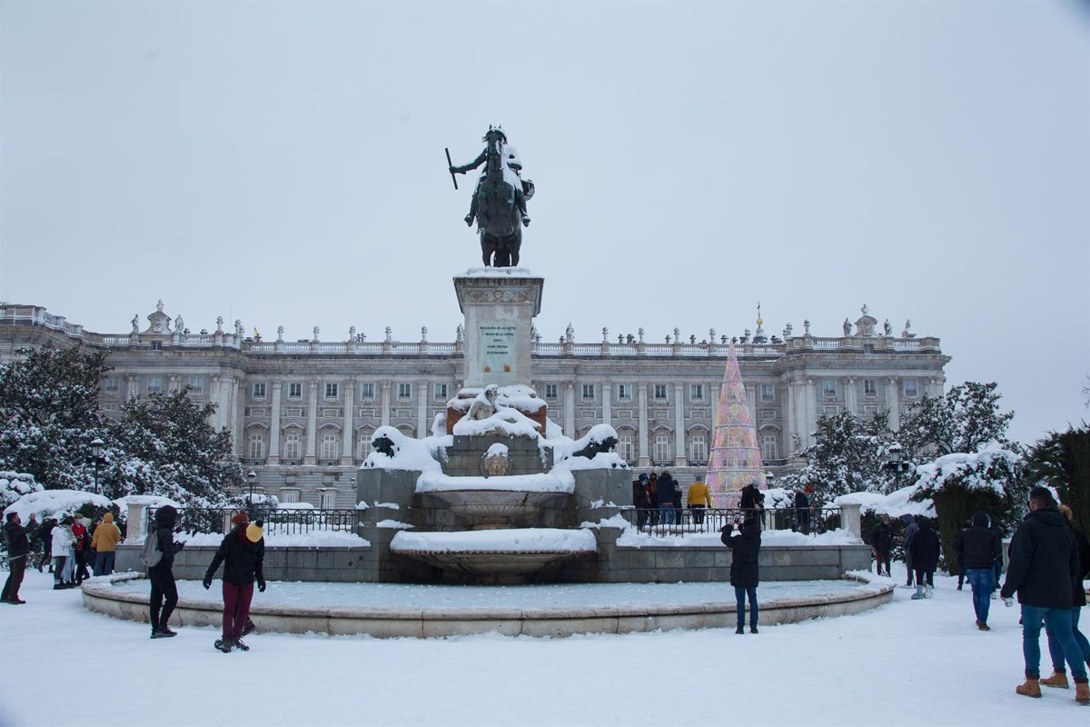 Archivo - Transeúntes pasean por la Plaza de Oriente durante la gran nevada provocada por la borrasca Filomena, en Madrid (España), a 9 de enero de 2021. La borrasca 'Filomena' ha provocado una intensa nevada en la Comunidad de Madrid, principalmente - Irina R.H. - Europa Press - Archivo