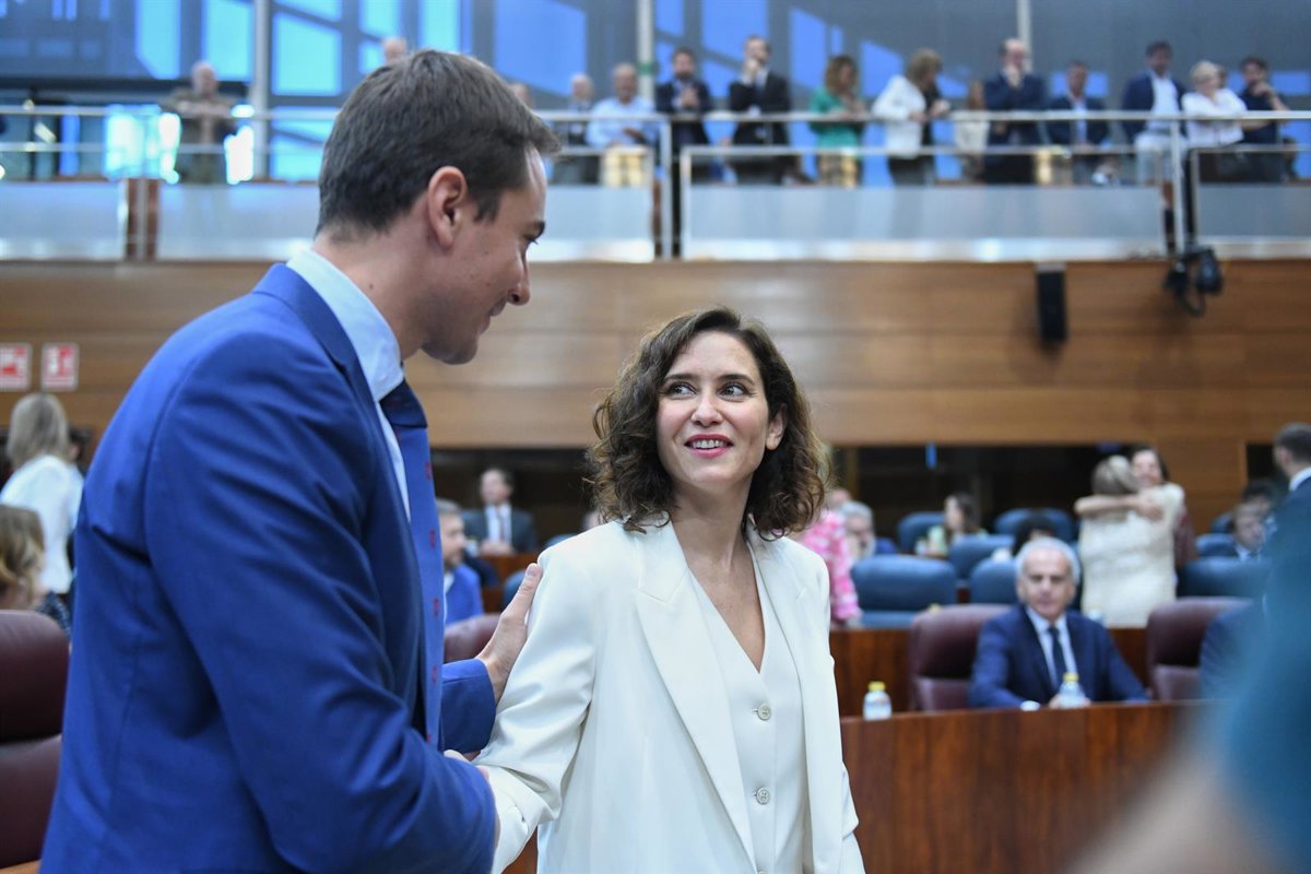 Archivo - La presidenta en funciones de la Comunidad de Madrid, Isabel Díaz Ayuso, saluda al portavoz del PSOE en la Asamblea, Juan Lobato, - Fernando Sánchez - Europa Press - Archivo
