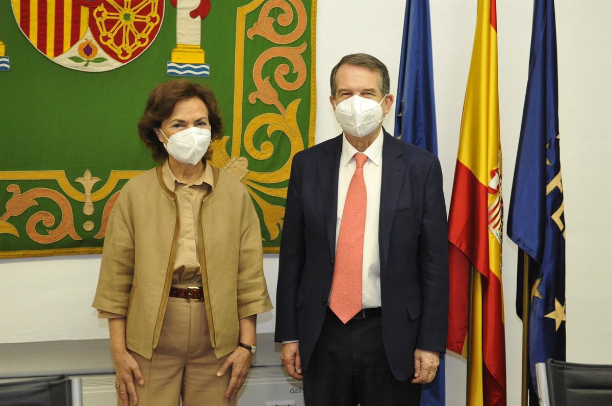 La vicepresidenta primera del Gobierno y ministra de Presidencia, Relaciones con las Cortes y Memoria Democrática, Carmen Calvo, durante su reunión con el presidente de la FEMP y alcalde de Vigo, Abel Caballero. - FEMP