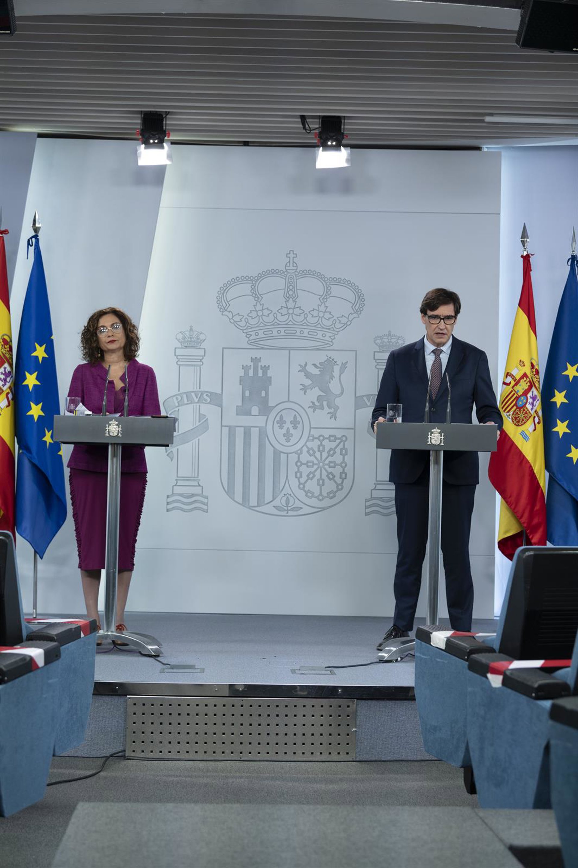 El ministro de Sanidad, Salvador Illa (d), y la ministra de Hacienda y portavoz del Gobierno, Maria Jesús Montero (i), comparecen en rueda de prensa tras el Consejo de Ministros - Moncloa