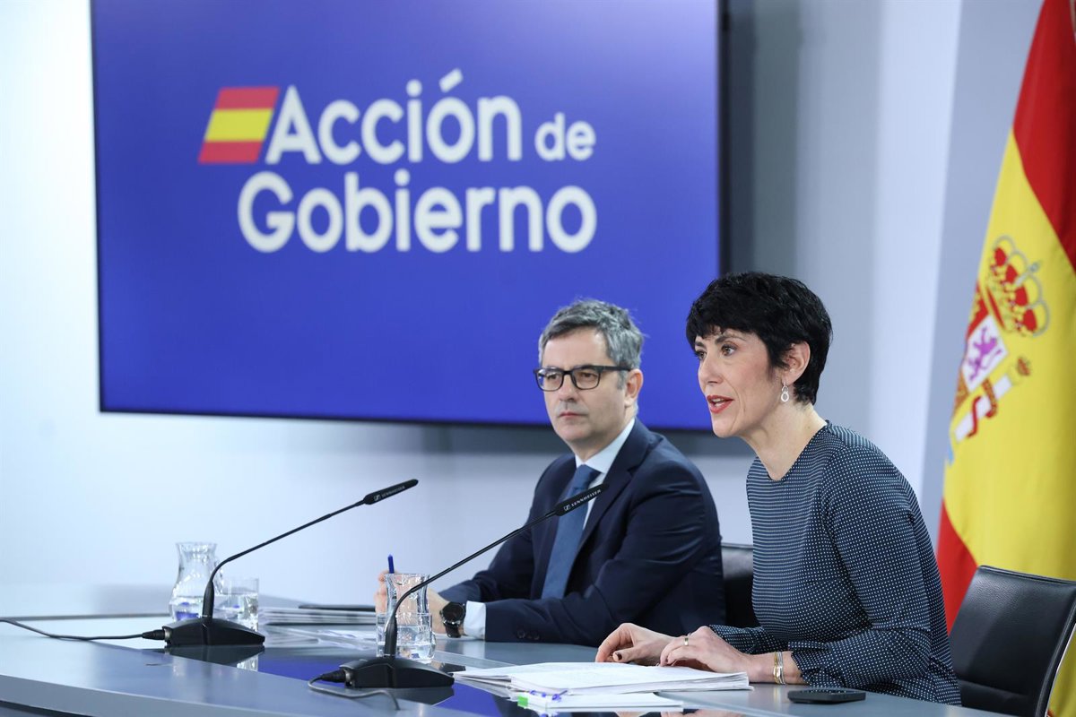 El ministro de la Presidencia, Justicia y Relaciones con las Cortes, Félix Bolaños, y la ministra de Seguridad Social, Inclusión y Migraciones, y Portavoz del Gobierno, Elma Saiz, durante una rueda de prensa tras el Consejo de Ministros. - Marta Fernández - Europa Press