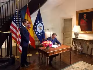 A su salida, el ministro de Sanidad ha dicho a la prensa que en su dedicatoria ha querido expresar "la cercanía con el pueblo de Estados Unidos" y el compromiso del Gobierno en "la defensa de las libertades": "Nosotros somos socios, aliados y amigos" del país norteamericano, ha apostillado.