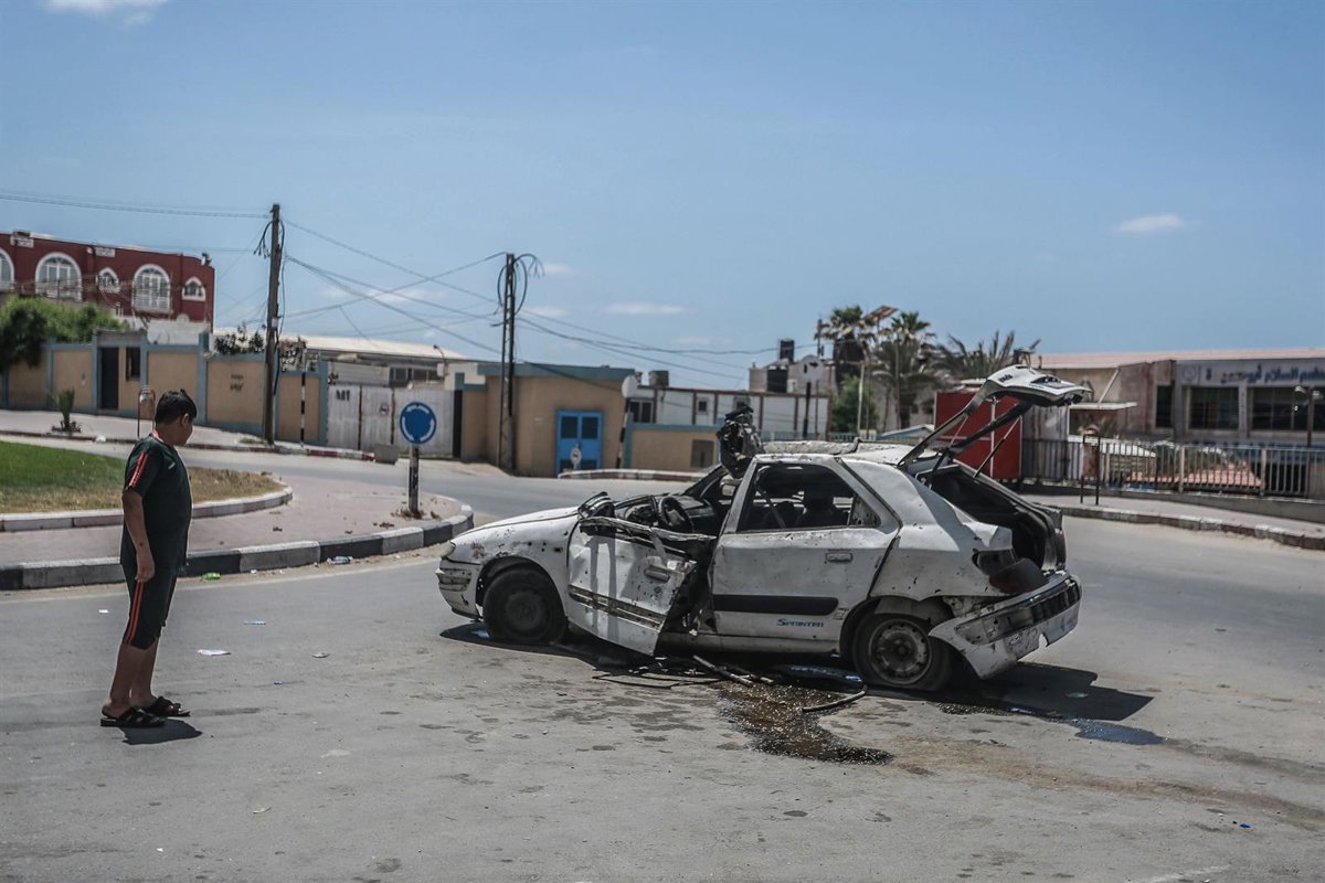 17 May 2021, Palestinian Territories, Gaza City: A Palestinian child stands next to a car that was hit by an Israeli airstrike, near the beach in Gaza City, amid the escalating flare-up of Israeli-Palestinian violence. Photo: Mohammed Talatene/dpa - Mohammed Talatene/dpa