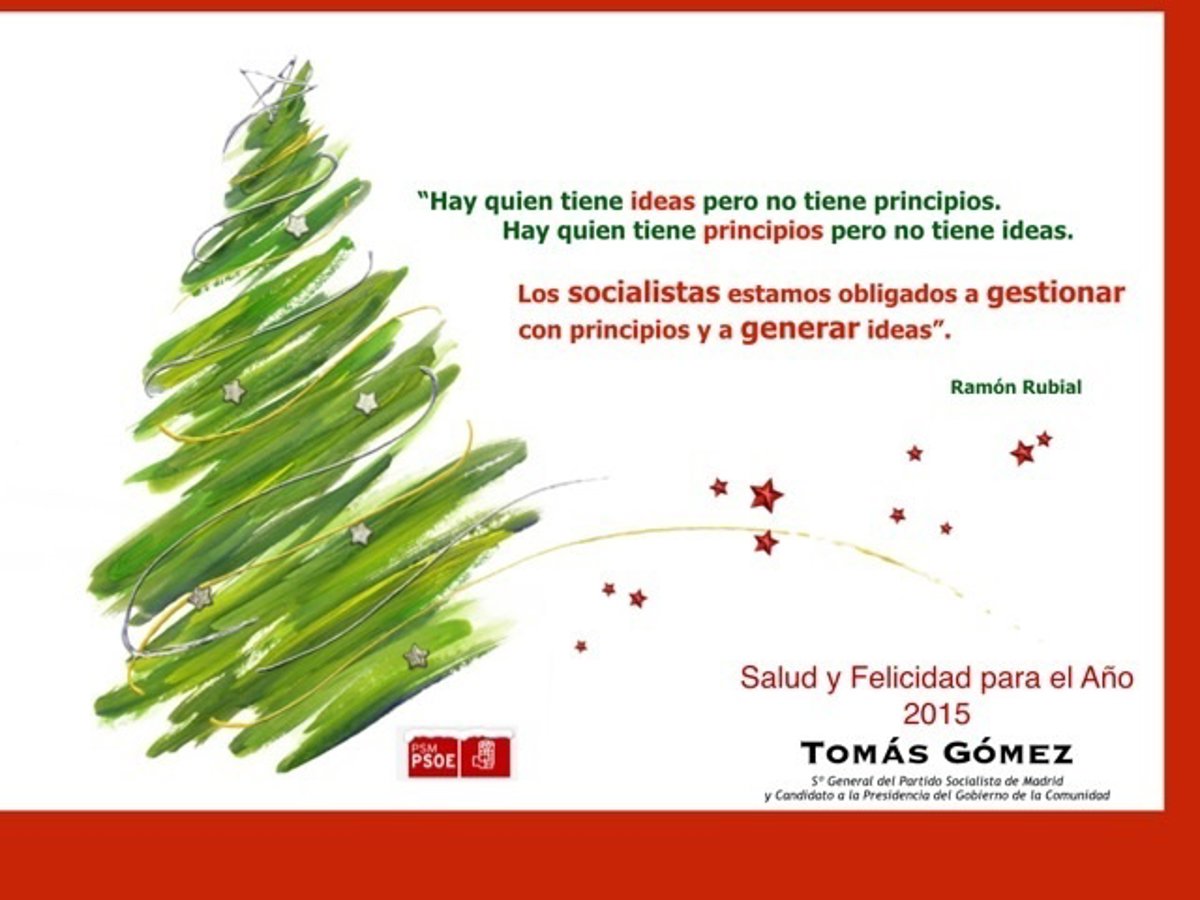 "Hay quien tiene ideas pero no tiene principios. Hay quien tiene principios pero no tiene ideas. Los socialistas estamos obligados a gestionar con principios y a generar ideas", es la frase que se puede leer en la tarjeta de felicitación con los colores rojo, blanco y verde, donde, además, desea "salud y felicidad para 2015" junto con la imagen de un árbol de Navidad.