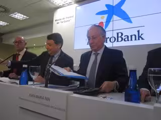 Ignacio González con Juan María Nin (CaixaBank) en rueda de prensa