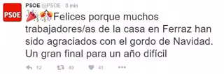 "Felices porque muchos trabajadores/as de la casa en Ferraz han sido agraciados con el gordo de Navidad. Un gran final para un año difícil", ha anunciado el PSOE en Twitter.
