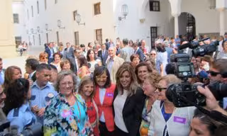 En ese momento se ha visto prácticamente arrastrada por numerosos diputados y dirigentes socialistas deseosos de felicitarla, buena parte de los cuales lucían pegatinas de color morado con el lema 'Todas somos presidentas', una iniciativa ideada por la presidenta del PSOE-A, Amparo Rubiales.