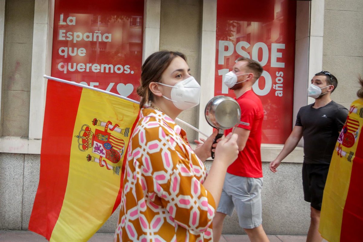 Una mujer toca una cacerola durante el cuarto día de protestas por la gestión del Gobierno en la crisis del coronavirus, frente a la sede del PSOE de la calle Ferraz en Madrid a 19 de mayo de 2020. - Ricardo Rubio - Europa Press