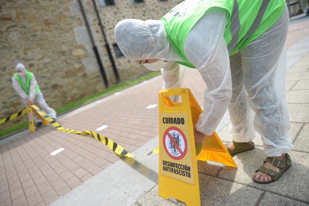 Un grupo de personas ataviadas con monos de plástico y que se han autodenominado "brigada antifascista" han simulado la limpieza de las calles de la localidad vizcaína de Miravalles, después del paso por el municipio de dirigentes de Ciudadanos que, encabezados por su presidente, Albert Rivera, han realizado este jueves un paseo por el pueblo y un acto de homenaje a las víctimas del terrorismo.