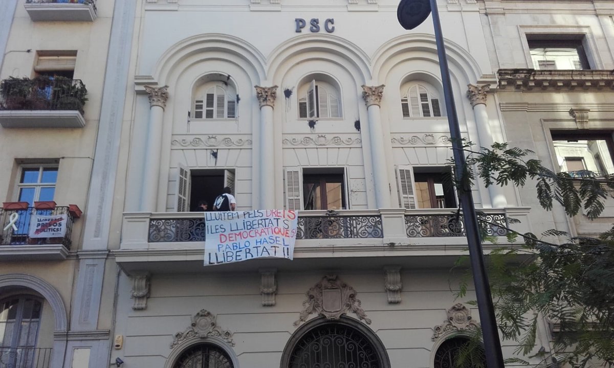 Unos 15 jóvenes han entrado este lunes en la sede del PSC de Lleida y ha colgado una pancarta en la que piden la libertad para el rapero leridano Pablo Hasel, ha explicado el colectivo en un comunicado.