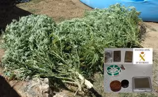 La plantación estaba compuesta por tres plantas de marihuana que arrojaron un peso bruto de 14 kilos (unas 56.000 dosis), además de 300 gramos de hachís (unas 1.216 dosis).