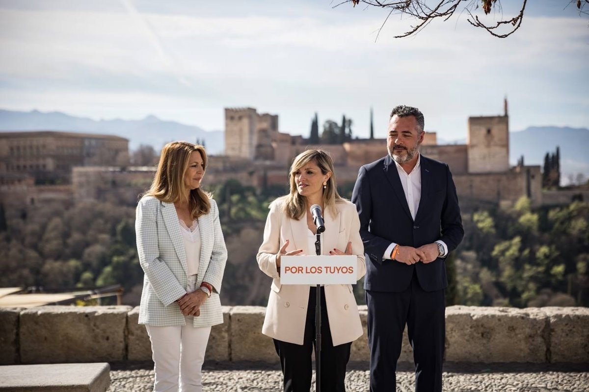 La portavoz nacional de CS, Patricia Guasp, el presidente de la formación en Andalucía, Andrés Reche, y la candidata a la Alcaldía de Granada, Concha Insúa, en el mirador de San Nicolás de Granada, frente a la Alhambra. - CS