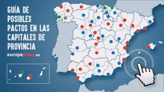 En este mapa puedes ver los partidos políticos que previsiblemente gobernarán cada capital de provincia, teniendo en cuenta que están a expensas de que la izquierda llegue a pactos entre sí (con gobiernos formados por hasta tres y cuatro formaciones políticas) y que Ciudadanos vote a favor o se abstenga en aquellas capitales en las que los 'populares' hayan sido la lista más votada.