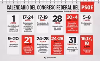 La segunda fuerza en número de votos de España elegirá a su nuevo líder el próximo 21 de mayo, en unas primarias a las que están llamados a participar cerca de 178.000 militantes. El proceso será la antesala del 39º Congreso Federal del PSOE, que se celebrará los días 16, 17 y 18 de junio.
