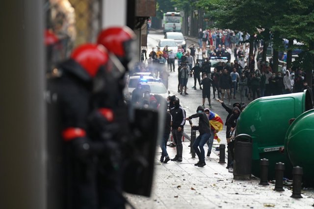 La Ertzaintza carga contra antifascistas y radicales que han lanzado botes de humo, piedras, huevos y han quemado contenedores