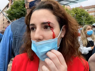 "Le han partido una ceja a una Diputada del Vox de una pedrada en Sestao (Vizcaya). Después de una hora la plaza sigue asediada y no hay dispositivo de seguridad que nos permita salir. ¿Derechos y libertades? No para todos en España", ha denunciado por su parte Macarena Olona en un mensaje en su cuenta personal de Twitter.