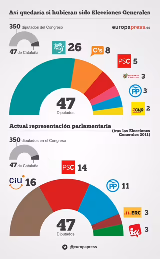 Así, de los 47 diputados de los 350 del Congreso de los Diputados que se eligen en las cuatro circunscripciones catalanas, el grupo formado por Junts pel Sí se quedaría con más de la mitad, 26 escaños, siete más de los que obtuvieron conjuntamente CiU y ERC en las últimas elecciones generales.