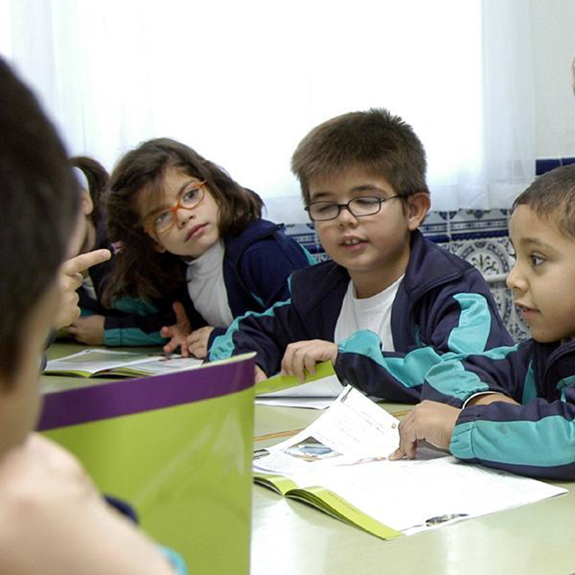 El centro educativo, en forma de L, está constituido por distintos volúmenes que buscan siempre la mejor orientación y la separación de los espacios de Infantil y Primaria; estos últimos se unen por las zonas comunes del comedor, sala de usos múltiples y el polideportivo.